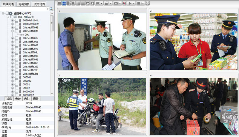 監(jiān)控客戶端軟件可同時監(jiān)視多路前端單兵終端圖像功能。可以設置4分屏、6分屏、9分屏和16分屏